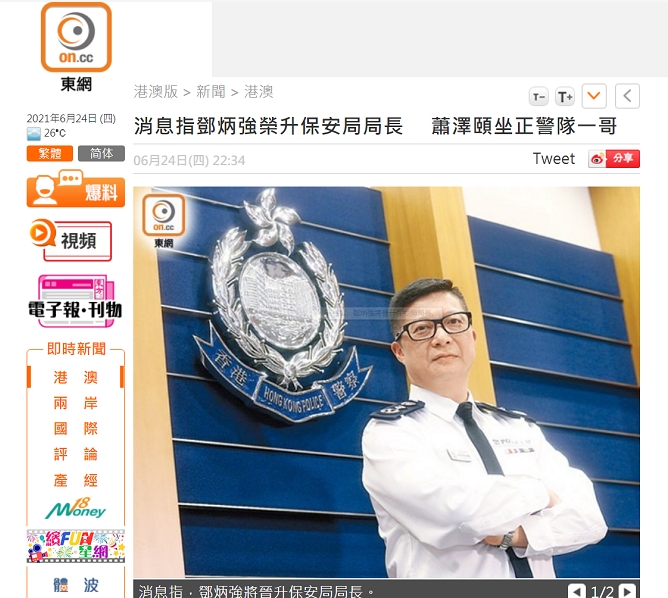 原标题:港媒:邓炳强将离任港警“一哥”,接替李家超任保安局局长